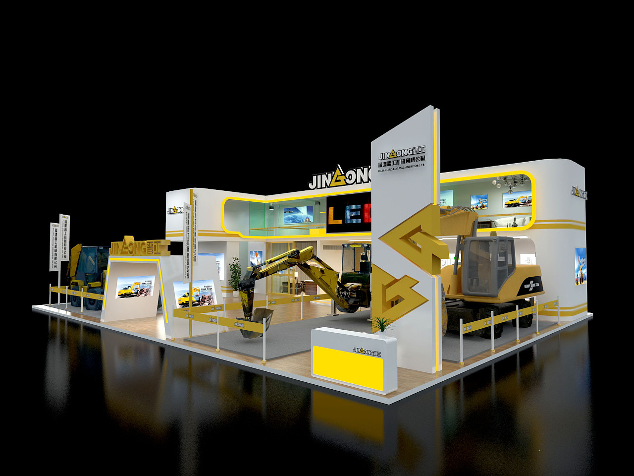 在展臺設(shè)計(jì)方面,美刻會展在接觸晉工機(jī)械時,科技力量是晉工機(jī)械給人的第一印象。因此在展臺設(shè)計(jì)整體方面是以科技感突出科技力量的印象。